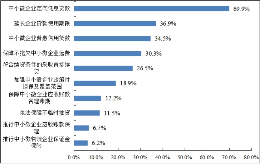 超過三分之一的企業希望延長企業貸款使用期限。目前,銀行貸款往往是一年一貸,企業往往需要提前3個月就把錢籌備出來準備償還,資金只能使用9個月左右,這也是一年期貸款利用效率不高的原因之一。超過四分之一的企業希望銀行對于符合條件的企業采取直接續貸政策。企業反映,銀行自動展期還很難實現,仍需要先還后貸,資金使用成本較高。還有企業希望依法保障不臨時抽貸、斷貸,這也是導致企業突發風險的原因之一。