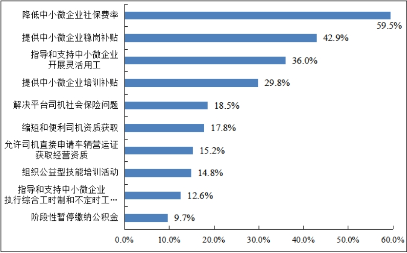 近兩成的企業希望解決平臺司機社會保險問題。近年來,隨著平臺經濟的發展,中小微企業使用平臺來尋找車源日益普遍。但是平臺上的司機大部分是個體性質,沒有工傷保險等社會保險導致出現事故后企業糾紛難以解決。