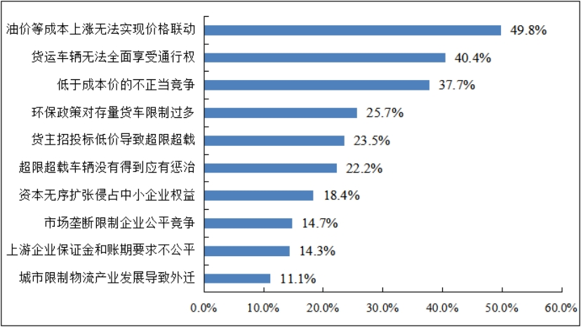 被調查企業認為物流市場特別是公路貨運市場存在的低于成本價不正當競爭。據《2021年貨車司機從業狀況調查報告》顯示,貨運互聯網平臺已經成為個體司機尋找貨源的重要渠道。對于個體司機貨運互聯網平臺使用中存在的問題,反映最大的是壓低運價行為,78.8%的司機認為存在壓低運價行為,占比接近八成。這對于中小微企業也是面臨同樣的問題,低于成本價的不正當競爭擾亂了市場秩序,導致中小微企業利潤水平過低無法投入再生產。