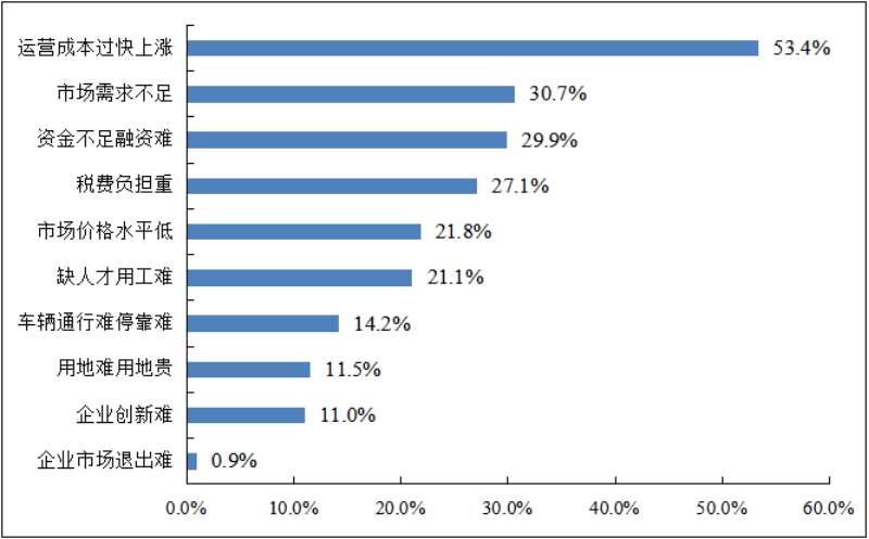 被調查企業中,超過一半的企業反映限制行業發展最大的問題是運營成本過快上漲,包括能源、人力、用地、資金等成本壓力持續加大,中小微企業抗風險能力不足,行業虧損面加劇將無法保障吸納就業,增加社會不穩定。