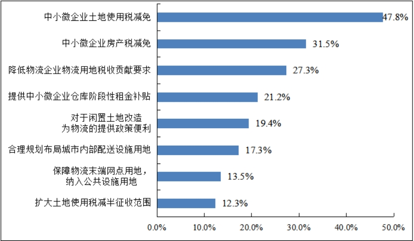 排名第二的是降低物流企業物流用地稅收貢獻要求。目前,各地對于物流用地投資強度、稅收貢獻等要求過高,一二線城市物流用地稅收貢獻每年在畝均50萬以上,單靠物流業務不可能實現。近年來,企業反映不僅新增用地難,而且現有用地由于稅收貢獻不足也有被要求騰退的情況。大量倉儲設施不得不疏解到遠離城市或其他城市,增加了城市配送成本和應急保障風險。