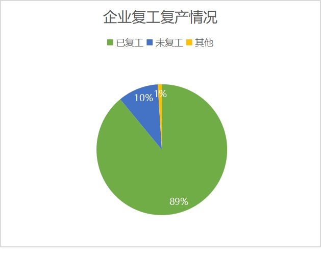 一季度以來,各地政府為企業復工復產提供了較為周到細致的服務,因而整體復工情況較好,復工率達89%,未復工企業占比10%;其他情況占比1%。
