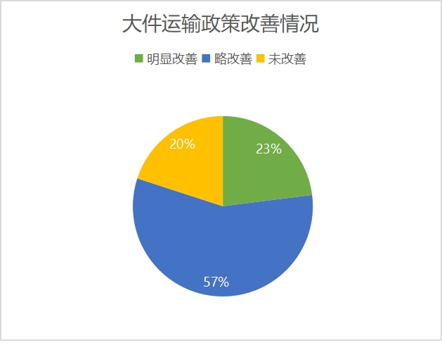 在大件運輸政策法規環境方面,認為明顯改善的企業占比23%,認為略有改善的企業占比57%,認為未改善的企業占比20%。