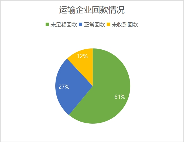 一季度各企業運輸收入回款效率及數額低于去年同期水平,普遍出現回款賬期較長,回款數額不理想。其中,出現回款賬期較長,不能足額回款的企業占比61%,能夠及時正常回款的企業占比27%,一季度未收到回款的企業占比12%。