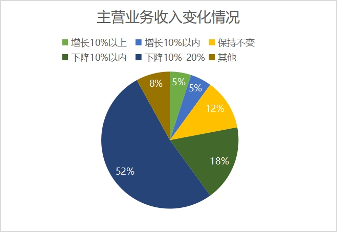 2022年一季度業務收入普遍下降,其中,增長10%以上的占比5%;增長10%以內的占比5%;保持不變的占12%;下降10%以內的占比18%;下降10%-20%的占比52%;其他情況占8%。