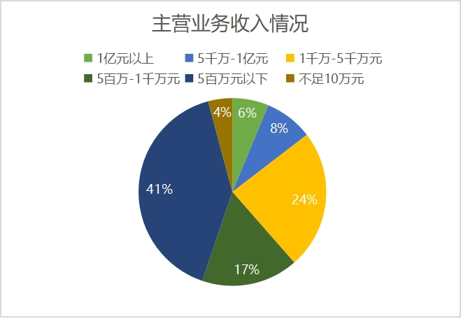 一季度企業主營業務收入在1億以上的占比6%,5000萬至1億的占比8%,1000萬至5000萬占比23%,500萬至1000萬的占比16%,500萬以下的占比39%,其中還有4%的企業一季度收入不到10萬元。
