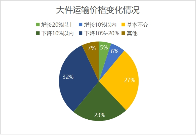 與去年同期相比,企業普遍認為,一季度大件運輸價格總體有所下降。其中,認為價格增長20%以上的占比5%;認為價格增長10%以內的占比6%;認為價格基本不變的占比27%;認為價格下降10%以內的占比23%;認為價格下降10-20%的占比32%;其他情況占比7%。