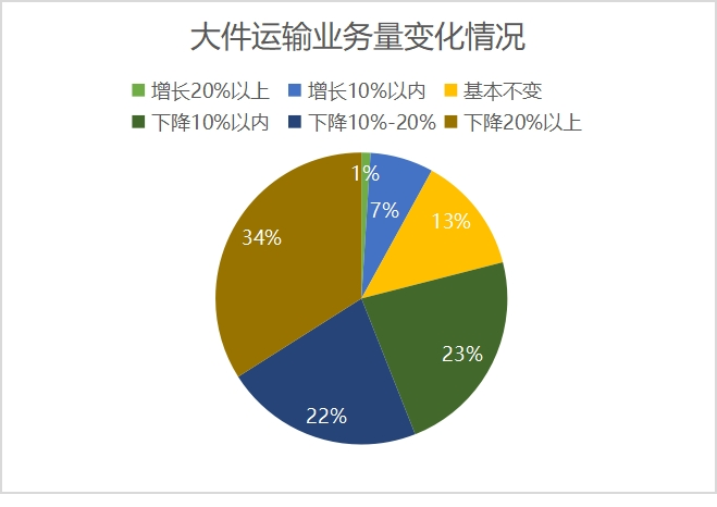 與去年同期相比,一季度企業大件運輸業務量,增長20%以上的占比1%;增長10%以內的占比7%;基本不變的占比13%;下降10%以內的占比23%;下降10%-20%的占比22%;下降20%以上的占比34%。
