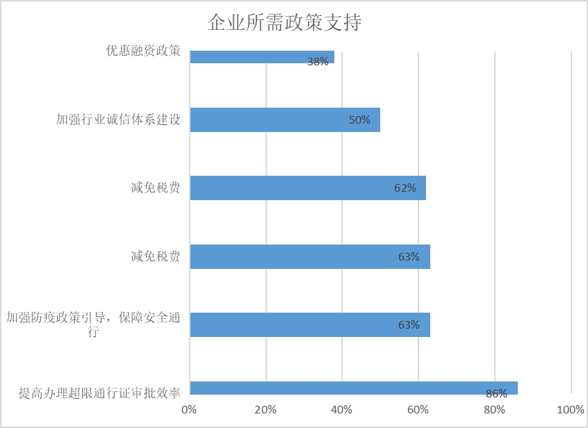 大件運輸企業集中關心并反映的訴求,主要包括:提高辦理超限通行證審批效率、減免稅費、加強防疫政策引導,保障安全同行、制定行業標準四個方面,分別占比為86%、63%、63%和62%。50%的企業認為應加強行業誠信體系建設,38%的企業認為需要優惠融資政策支持等。