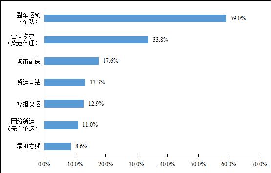 此次參與調查的企業經營業務涉及多個細分市場,如下圖所示,其中從事整車運輸(車隊)業務占比最多,達到59%;其次,合同物流與貨運代理業務占比33.8%,零擔運輸業務占比21.5%(零擔快運企業12.9%,零擔專線企8.6%),城市配送業務占比為17.6%,從事貨運場站運營的占比為13.3%,網絡貨運類的平臺企業占比為11%。