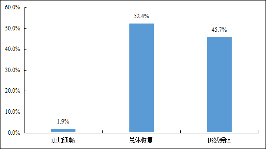 隨著物流保通保暢政策出臺和落實,交通物流“大動脈”基本暢通。據交通運輸部數據,5月底,高速公路貨運量已恢復至正常年份的九成左右。調查數據顯示,截止到5月底,超過一半(52.4%)的企業反饋道路通行總體恢復。