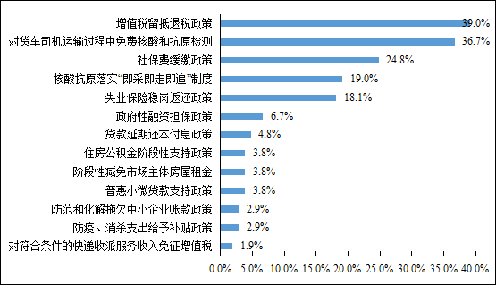 增值稅留抵退稅政策普遍反映得到享受。接近4成(39%)的企業反映已經享受。交通運輸、倉儲和郵政業作為先期實行的行業政策總體落實情況較好,一定程度上緩解了企業資金緊缺壓力,但是也有企業反映享受政策會導致稅務稽查問題。此外,社保緩繳、失業保險穩崗返還、公積金階段性緩繳等普惠性政策落實較好。