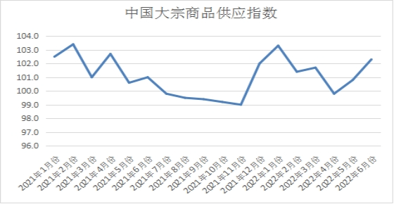 2022年6月份,大宗商品供應指數為102.3%,較上月上升1.5個百分點。供應指數連續兩個月呈現上升走勢,且升至近五個月以來的高點。本月指數繼續上升,我們認為一方面雖鋼鐵等商品生產虧損嚴重,企業生產積極性下降,但隨著疫情得到有效控制,商品物流逐漸恢復,大部分生產企業預期向好,商品產量整體上升,加之部分商品進口量增加,令市場供應繼續增加;另一方面,也是由于之前基數較低,也是本月指數回升的重要因素。從各主要商品情況來看,本月除鋼鐵行業受虧損影響出現供應下降外,其余品種均呈現供應增加的局面,特別是成品油、有色金屬和化工供應量,受其余復工復產增加的影響,供應量止跌回升。