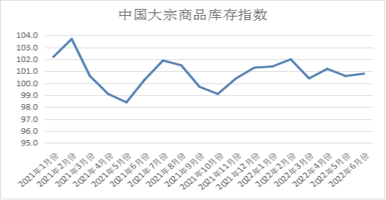 2022年6月份,大宗商品庫存指數繼續上升,當月較上月上升0.2個百分點,至100.8%,顯示隨著供應增速加快,需求增速緩慢,商品庫存開始增加,庫存壓力有所加大。各主要商品中,鐵礦石庫存量受需求減弱的影響,止跌回升,成品油庫存量增速加快,煤炭、有色金屬和化工庫存量增速有所減緩,鋼鐵和汽車庫存量由升轉降。