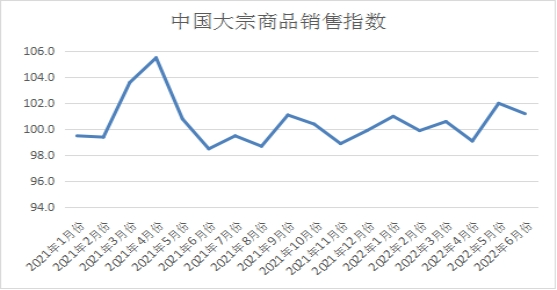 2022年6月份,大宗商品銷售指數為101.2%,較上月回落0.8個百分點,顯示國內大宗商品市場銷售增速出現減緩。從各主要商品的情況來看,鐵礦石受鋼鐵行業減產影響較大,本月銷售量降幅明顯,其余品種雖銷售繼續增加,但各品種受終端需求整體恢復狀況各有差異的影響,銷售增速出現分化。