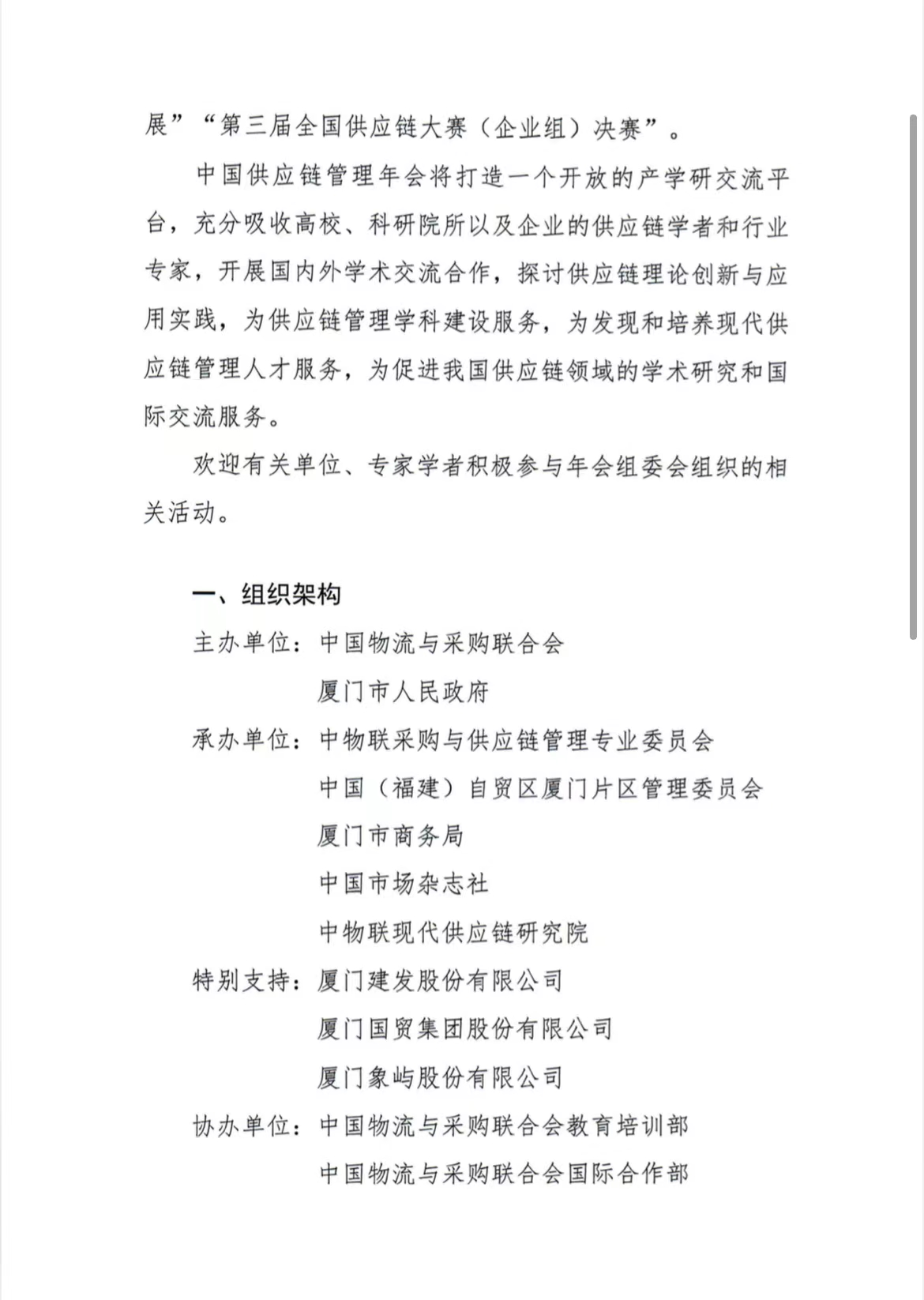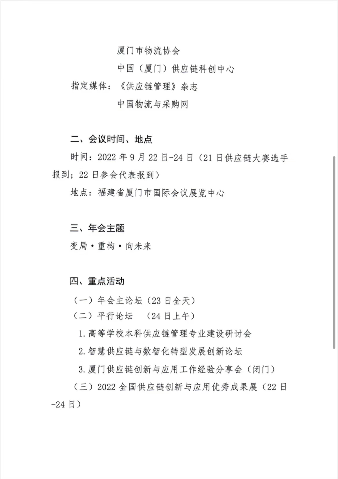 為有效落實供應鏈安全的國家戰略,提升我國供應鏈理論創新與實踐應用,中國物流與采購聯合會定于2022年9月22日-24日在福建省廈門市召開“第三屆中國供應鏈管理年會”,并同期舉辦“2022全國供應鏈創新與應用優秀成果展”“第三屆全國供應鏈大賽(企業組)決賽”。