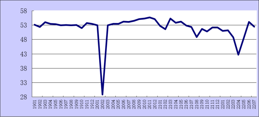 中國物流與采購聯合會、國家統計局服務業調查中心采購經理調查發布的2022年7月份綜合PMI產出指數為52.5%,較上月下降1.6個百分點。該指數是PMI指標體系中反映當期全行業(制造業和非制造業)產出變化情況的綜合指數,由制造業生產指數與非制造業商務活動指數加權求和而成,權數分別為制造業和非制造業占GDP的比重。