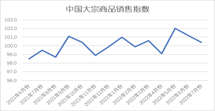 2022年7月份,大宗商品銷售指數(shù)兩連降至100.4%,較上月下跌0.8個(gè)百分點(diǎn)。各主要商品中,鐵礦石銷售量受鋼廠減產(chǎn)的影響繼續(xù)下降,煤炭銷售量也出現(xiàn)下滑,有色金屬、化工和汽車銷售量雖有增加,但增速有所減緩,鋼鐵和成品油市場(chǎng)銷售狀況良好,銷售增速加快。