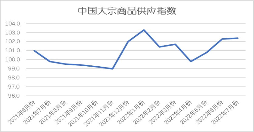 2022年7月份,大宗商品供應(yīng)指數(shù)繼續(xù)上升,當(dāng)月較上月上升0.1個(gè)百分點(diǎn),至102.4%,指數(shù)升至近六個(gè)月以來的最高。從目前商品供應(yīng)端的情況來看,利潤(rùn)、需求和預(yù)期是企業(yè)生產(chǎn)的主要推手,導(dǎo)致各商品供應(yīng)狀況略有不同。從6月份開始,物流逐漸恢復(fù)令原材料供應(yīng)緊張的局面得到緩解,給企業(yè)復(fù)工、復(fù)產(chǎn)提供保障,商品產(chǎn)量開始回升,本月大部分商品產(chǎn)量繼續(xù)回升,特別是生產(chǎn)企業(yè)對(duì)后市預(yù)期良好,生產(chǎn)熱情高漲,整體商品供應(yīng)增速持續(xù)加快。各主要商品中,鐵礦石、煤炭、成品油、有色金屬和汽車供應(yīng)量繼續(xù)增加,且增速加快,化工供應(yīng)量雖有增加,但增速有所減緩,本月鋼鐵供應(yīng)量受鋼廠虧損、產(chǎn)量下降的影響,繼續(xù)減少,且降幅有所擴(kuò)大。