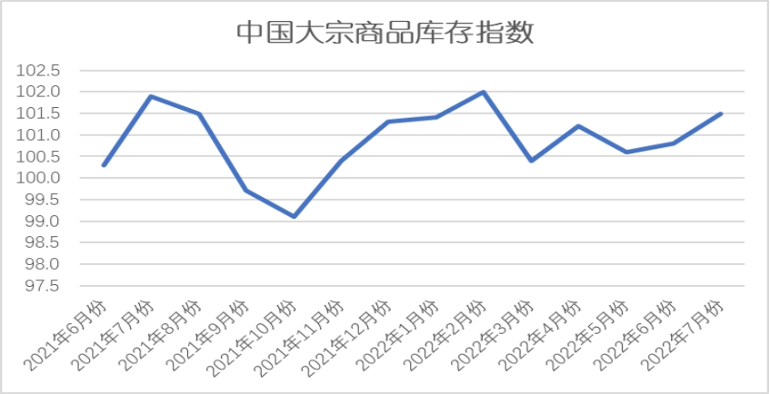 2022年7月份,大宗商品庫(kù)存指數(shù)兩連升,至101.5%,較上月上升0.7個(gè)百分點(diǎn),顯示國(guó)內(nèi)大宗商品市場(chǎng)供需進(jìn)一步失衡,商品庫(kù)存持續(xù)增加,且增速加快。各主要商品中,除鋼鐵庫(kù)存量受供應(yīng)下降繼續(xù)減少外,其余品種均呈現(xiàn)增加態(tài)勢(shì),特別是汽車庫(kù)存量止跌回升。