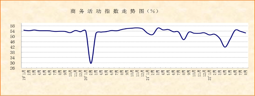 中國物流與采購聯合會、國家統計局服務業調查中心發布的2022年8月份中國非制造業商務活動指數為52.6%,較上月下降1.2個百分點,連續2個月環比下降,且降幅較上月有所擴大,但仍高于去年同期和上半年平均水平。綜合指數變化,非制造業經營活動仍保持恢復,但恢復力度有所減弱。