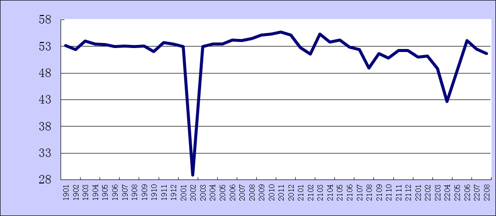 中國物流與采購聯合會、國家統計局服務業調查中心采購經理調查發布的2022年8月份綜合PMI產出指數為51.7%,較上月下降0.8個百分點。該指數是PMI指標體系中反映當期全行業(制造業和非制造業)產出變化情況的綜合指數,由制造業生產指數與非制造業商務活動指數加權求和而成,權數分別為制造業和非制造業占GDP的比重。