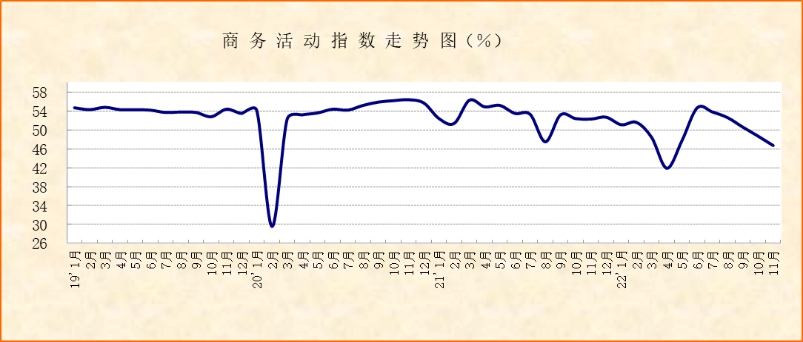 中國物流與采購聯(lián)合會(huì)、國家統(tǒng)計(jì)局服務(wù)業(yè)調(diào)查中心發(fā)布的2022年11月份中國非制造業(yè)商務(wù)活動(dòng)指數(shù)為46.7%,較上月下降2個(gè)百分點(diǎn),連續(xù)5個(gè)月環(huán)比下降,連續(xù)2個(gè)月運(yùn)行在50%以下;新訂單指數(shù)為42.3%,較上月下降0.5個(gè)百分點(diǎn),連續(xù)3個(gè)月環(huán)比下降,連續(xù)5個(gè)月運(yùn)行在50%以下。綜合指數(shù)變化,11月份,在疫情波及面逐步擴(kuò)大的影響下,非制造業(yè)供需下行壓力進(jìn)一步加大。商務(wù)活動(dòng)指數(shù)和新訂單指數(shù)均創(chuàng)出2022年以來的次低點(diǎn),指數(shù)略好于2022年4月份。
