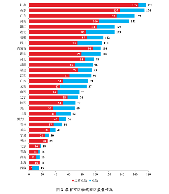 調(diào)查結(jié)果顯示,物流園區(qū)規(guī)劃布局與經(jīng)濟(jì)發(fā)展程度密切相關(guān)。東部地區(qū)物流需求較為旺盛,物流園區(qū)總數(shù)和運(yùn)營(yíng)園區(qū)數(shù)量前三名分別為江蘇、山東和廣東,均地處東部。中西部地區(qū)承接產(chǎn)業(yè)轉(zhuǎn)移,物流園區(qū)建設(shè)速度明顯加快,河南、湖北、安徽等省份園區(qū)總數(shù)分別排在第四、第六和第七。東北地區(qū)物流園區(qū)建設(shè)相對(duì)平穩(wěn),與經(jīng)濟(jì)發(fā)展水平有關(guān)。各省市區(qū)物流園區(qū)數(shù)量情況如圖3所示。