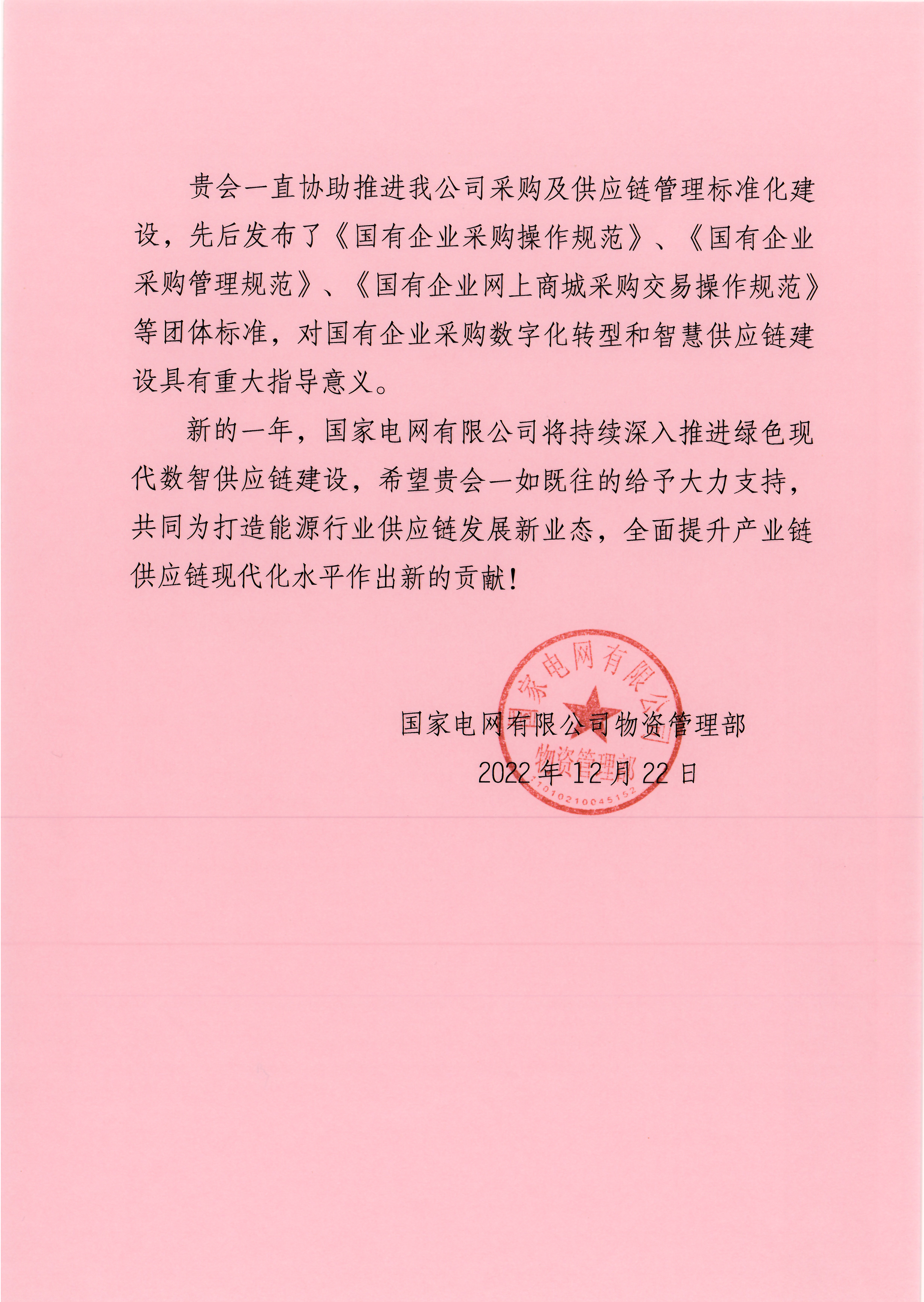國家電網有限公司致信感謝中物聯