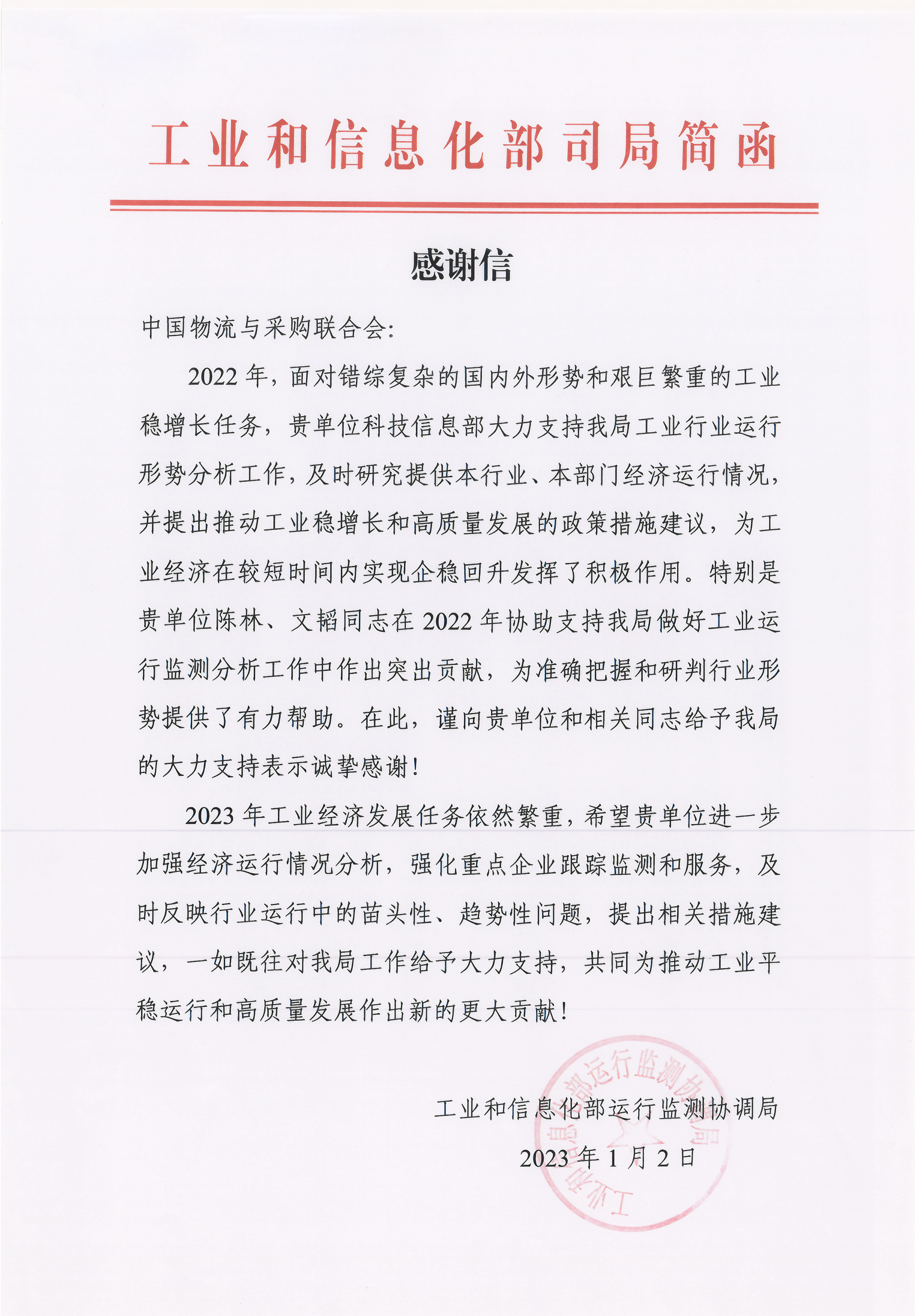 工信部運(yùn)行監(jiān)測(cè)協(xié)調(diào)局致信感謝中物聯(lián)