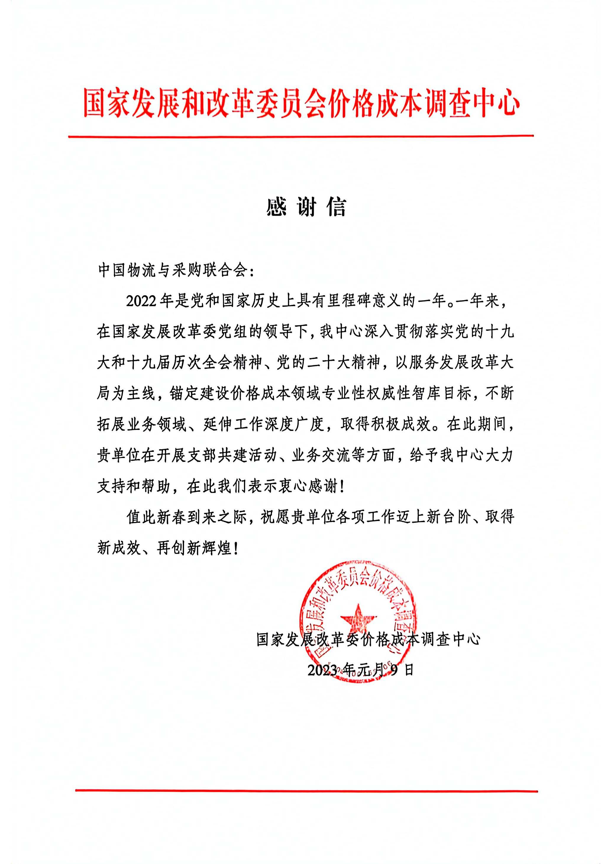 國家發展改革委價格成本調查中心致信感謝中物聯