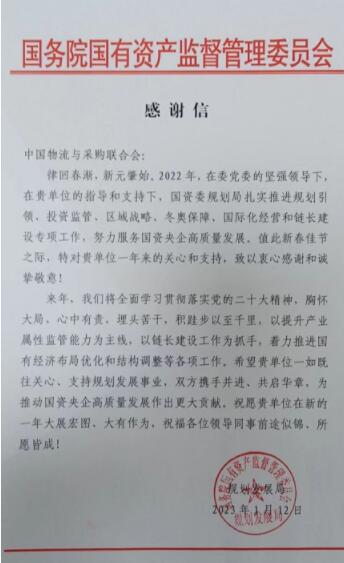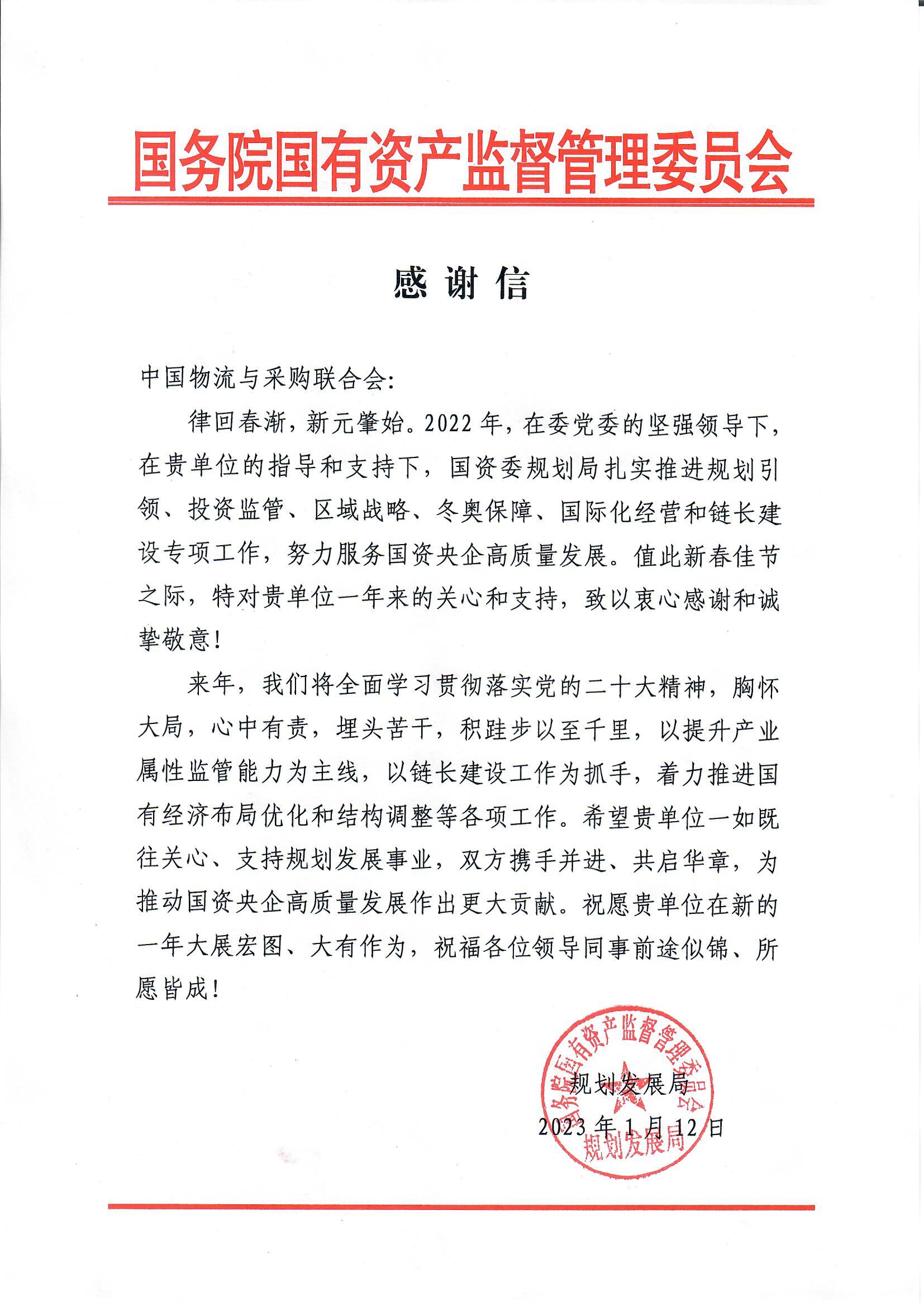 國資委規(guī)劃發(fā)展局致信感謝中物聯(lián)