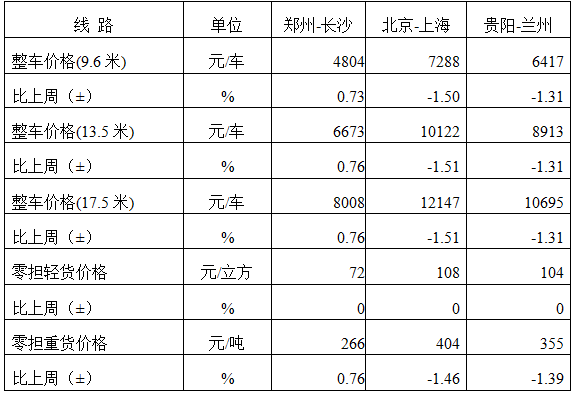 分車型看,各車型指數環比總體平穩。其中,整車指數為1027.46點,與上周基本持平;零擔輕貨指數為1041.33點,與上周基本持平;零擔重貨指數為1026.04點,比上周回升0.01%。