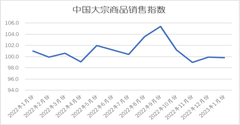 2023年1月份,大宗商品銷售指數(shù)為99.8%,較上月回落0.1個(gè)百分點(diǎn),本月處于春節(jié)月份,且指數(shù)水平和上月基本持平,我們認(rèn)為這顯示市場需求基本已處在筑底過程中,后期將逐步得到恢復(fù)。從各主要商品來看,本月鐵礦石和成品油消費(fèi)量受各自終端需求的提振而持續(xù)增加,且增速加快,其他品種均呈現(xiàn)不同程度的減少,其中鋼鐵銷售量降幅較上月有所收窄,煤炭和有色金屬銷售量降幅較上月則有所擴(kuò)大,化工和汽車銷售量均呈現(xiàn)由升轉(zhuǎn)降的態(tài)勢。