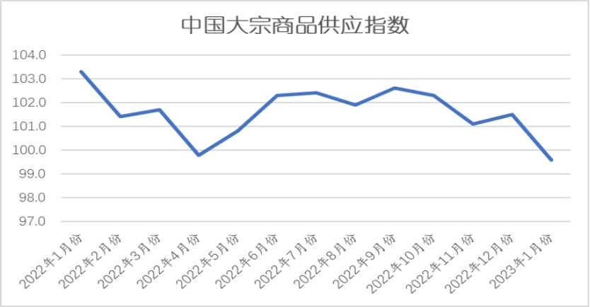 2023年1月份,大宗商品供應(yīng)指數(shù)跌至2021年12月份以來的最低,本月較上月回落1.9個(gè)百分點(diǎn),至99.6%,顯示受春節(jié)因素的影響,大部分生產(chǎn)企業(yè)提早進(jìn)入假期模式,導(dǎo)致商品產(chǎn)量下降,市場供應(yīng)出現(xiàn)明顯減少。從各主要商品來看,本月鋼鐵和汽車供應(yīng)量止跌回升,成品油供應(yīng)量增速減緩,鐵礦石、煤炭、有色金屬和化工供應(yīng)量均出現(xiàn)不同程度的減少。