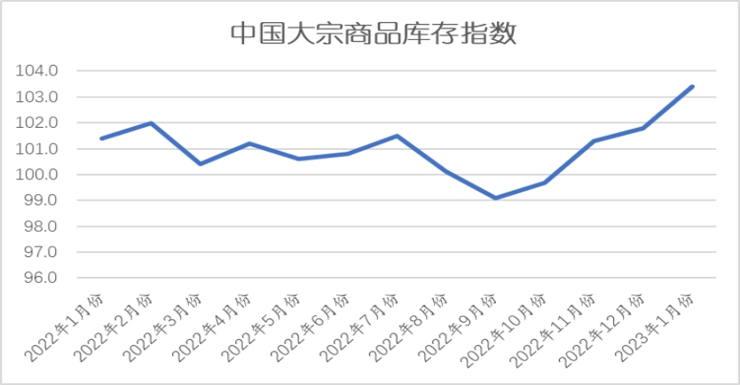 2023年1月份,大宗商品庫存指數(shù)四連升至2021年3月份以來的最高點(diǎn),為103.4%,庫存量增速較上月加快1.6個(gè)百分點(diǎn),顯示當(dāng)前國內(nèi)大宗商品市場在供需雙弱的背景下,供需失衡進(jìn)一步加劇,整體庫存仍在積壓,商品去庫存的難度較高。不過當(dāng)前的高庫存我們認(rèn)為無需太過憂慮,這要是受春節(jié)假期因素的影響,大部分商品庫存處于流通環(huán)節(jié)中,隨著需求啟動(dòng),庫存壓力必將有效緩解。從各主要商品來看,本月各商品庫存全面增加,特別是鐵礦石庫存量止跌回升,除成品油外,其余品種庫存量增速均有所加快。