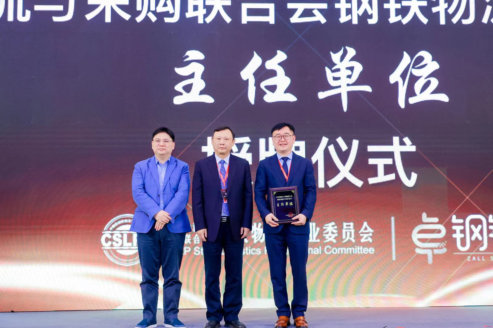 論壇同期,何黎明、西本新干線首席執行官虞鋼為上海卓鋼鏈電子商務有限公司授予新一屆“中國物流與采購聯合會鋼鐵物流專業委員會主任單位”牌匾。