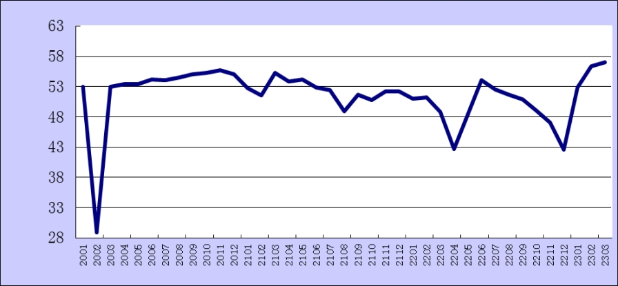 2023年3月份綜合PMI產出指數為57%