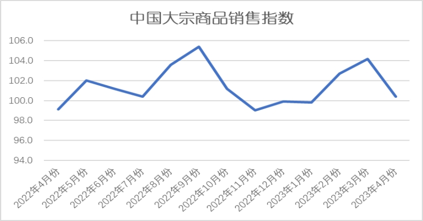 2023年4月份,大宗商品銷售指數為100.4%,較上月回落3.8個百分點,為近三個月以來的最低,顯示國內大宗商品市場在“金三”表現良好之后,“銀四”超預期走弱,本月市場旺季不旺,銷售增速出現減緩。這主要是:首先,雖然一季度國民經濟溫和復蘇,但投資和房地產行業拉動作用減弱,需求未能呈現爆發性增長,地方債發行量環比下降導致基建項目推進有所放緩,特別是房地產消費市場陷入冰點,市場信心略顯不足;其次,市場價格單邊走低,也抑制了投機需求的釋放,終端需求企業也已消耗庫存為主,備貨需求不高;最后,隨著近兩個月市場銷售量持續增加,基數較高,本月增速減緩也屬正常回歸。從各主要商品的情況來看,鋼鐵和煤炭銷售量均時隔兩個月后再現減少格局,鐵礦石、成品油、有色金屬和化工銷售量雖繼續增加,但增速分別出現減緩,汽車銷售量受政策和基數影響,本月小幅回升。