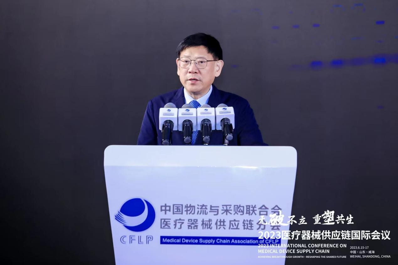 2023年6月16日,由中國物流與采購聯合會主辦,中國物流與采購聯合會醫療器械供應鏈分會承辦的2023(第三屆)醫療器械供應鏈國際會議在山東威海召開,中國物流與采購聯合會副會長兼秘書長崔忠付出席并致辭。