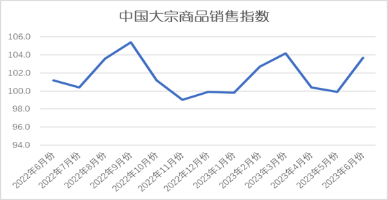 2023年6月份,大宗商品銷售指數(shù)止跌反彈,當(dāng)月較上月回升3.8個百分點(diǎn),至103.7%,顯示下游行業(yè)復(fù)蘇跡象明顯,市場訂貨積極性高漲,企業(yè)訂單組織順暢。不過,值得注意的是,本月指數(shù)明顯回升,是建立在前期基數(shù)較低的基礎(chǔ)上,實(shí)際上需求回升仍較為溫和,特別是6月下旬以來,受高溫多雨天氣影響,需求淡季效應(yīng)顯現(xiàn),市場情緒再度趨于謹(jǐn)慎。從各主要商品的情況來看,本月各商品銷售量較上月均有增加,其中,鋼鐵、鐵礦石和煤炭銷售量止跌回升,有色金屬、化工和汽車銷售量繼續(xù)增加,且增速加快,成品油銷售量雖連續(xù)七個月增加,但本月受柴油需求下滑以及基數(shù)較高的影響,銷售增速略有減緩。