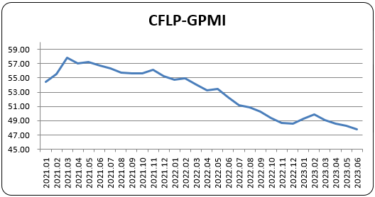 2023年6月份,美洲制造業(yè)PMI為46.5%,較上月下降0.8個百分點,連續(xù)8個月運行在50%以下,為2020年6月以來階段新低,顯示美洲制造業(yè)繼續(xù)保持下行態(tài)勢,且降速有所加快。主要國家數(shù)據(jù)顯示,除墨西哥制造業(yè)在50%以上外,美國、巴西、加拿大和哥倫比亞等國制造業(yè)PMI均在50%以下。