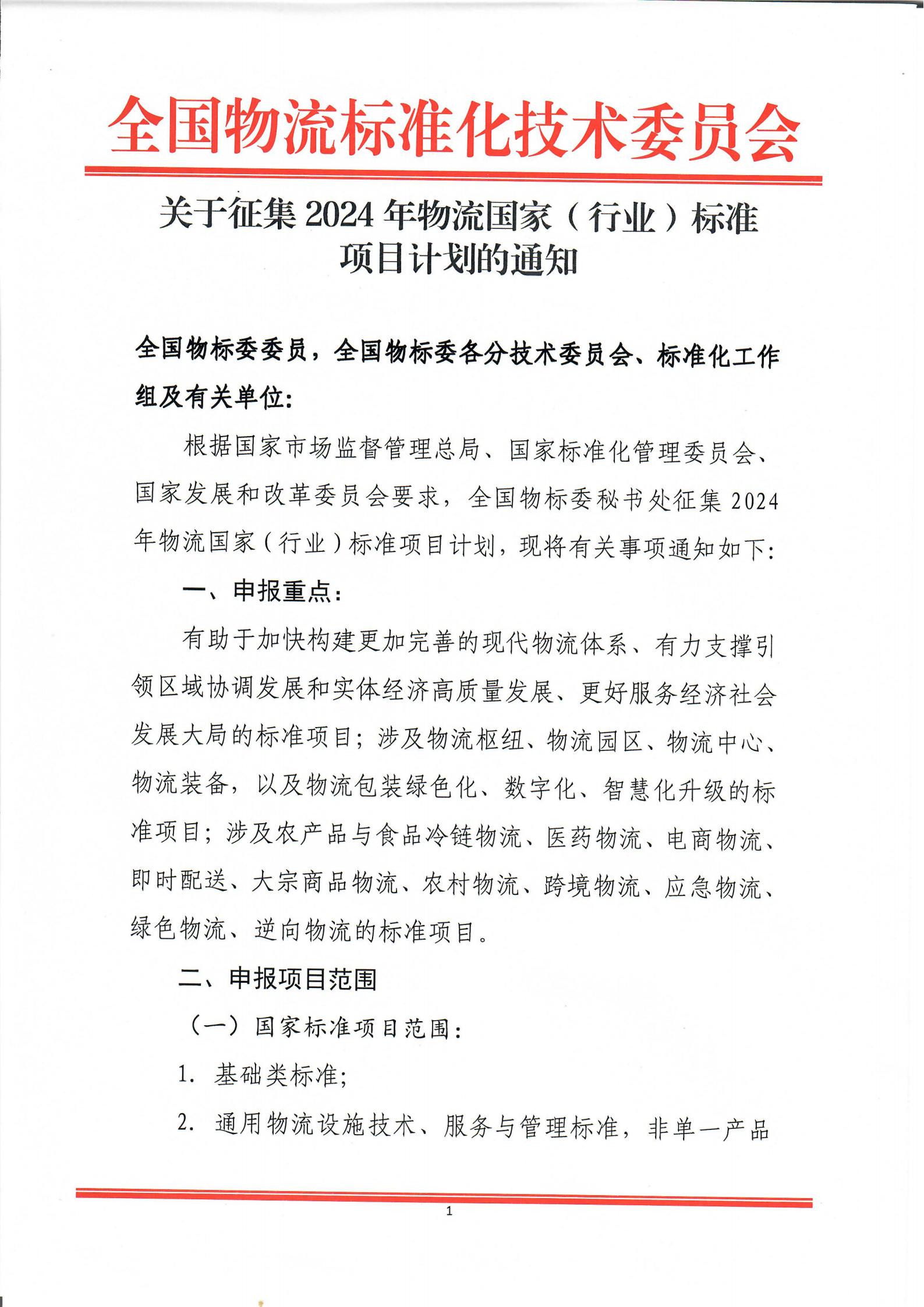 關(guān)于征集2024年物流國(guó)家(行業(yè))標(biāo)準(zhǔn)項(xiàng)目計(jì)劃的通知