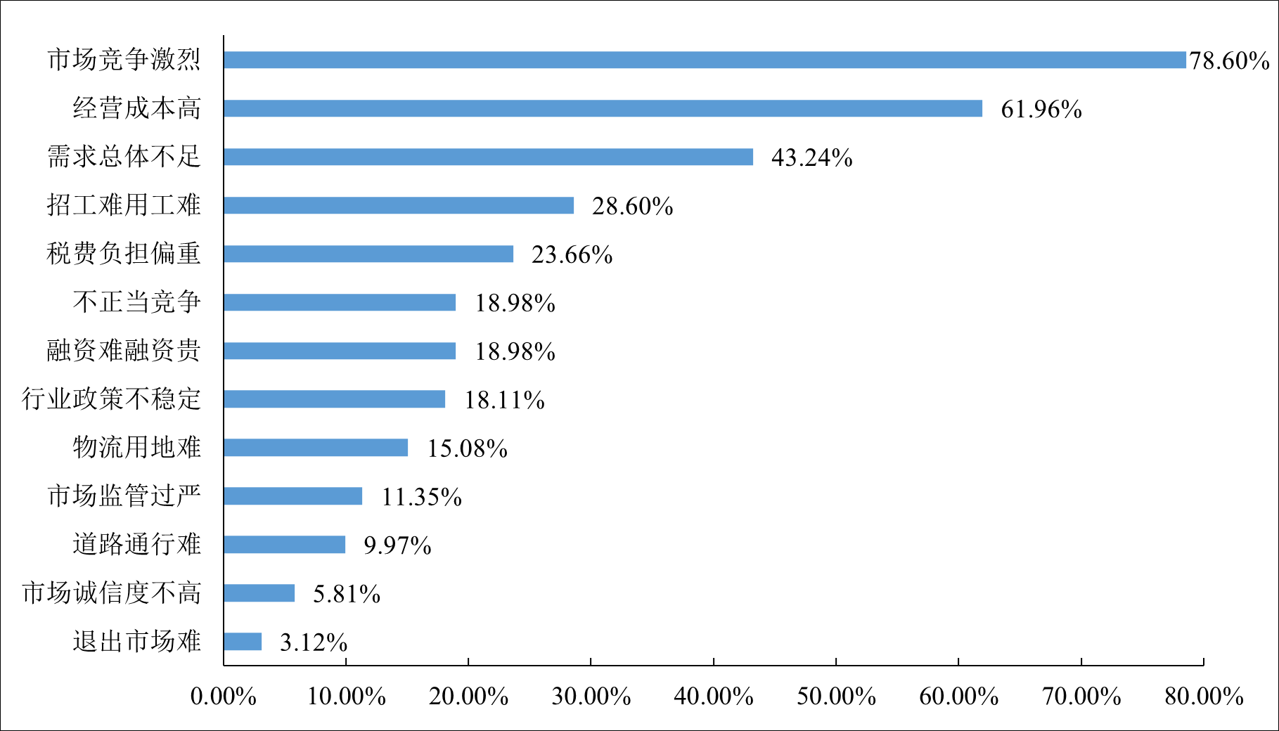 市場(chǎng)激烈競(jìng)爭(zhēng)成為基本環(huán)境。調(diào)查數(shù)據(jù)顯示,對(duì)于物流企業(yè)當(dāng)前面臨的主要困難,排名前三的依次是市場(chǎng)競(jìng)爭(zhēng)激烈、經(jīng)營(yíng)成本高、市場(chǎng)需求總體不足,分別占78.6%、61.96%和43.24%。分業(yè)務(wù)領(lǐng)域看,公路貨運(yùn)、水路貨運(yùn)、貨運(yùn)代理等領(lǐng)域面臨的最大困難是市場(chǎng)競(jìng)爭(zhēng)激烈,而城市配送、快遞等領(lǐng)域主要是經(jīng)營(yíng)成本高。大部分領(lǐng)域普遍反映需求不足,成為當(dāng)前制約行業(yè)發(fā)展的重要原因。