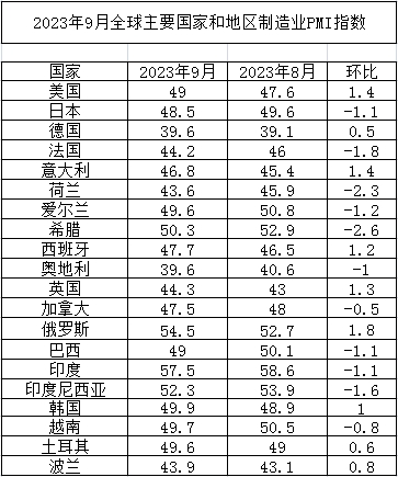 2023年9月份全球主要國(guó)家制造業(yè)PMI