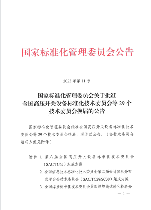 國家標準化管理委員會關于批準全國高壓開關設備標準化技術委員會等29個技術委員會換屆的公告.pdf
