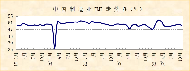 中國物流與采購聯合會、國家統計局服務業調查中心發布的2023年10月份中國制造業采購經理指數(PMI)為49.5%,較上月下降0.7個百分點。從分項指數變化來看,制造業市場需求受季節性影響有所波動,但企業生產活動仍持穩運行,裝備和消費品制造業生產保持增長,原材料價格增速也高位放緩,企業對后市預期保持樂觀。四季度,在市場內生動力穩定釋放以及穩經濟政策進一步發力的情況下,經濟回穩向好運行具備基礎。
