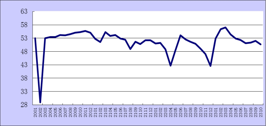 2023年10月份綜合PMI產(chǎn)出指數(shù)為50.7%