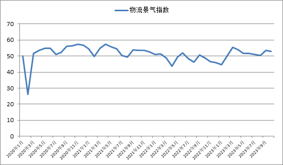 中國(guó)物流與采購(gòu)聯(lián)合會(huì)發(fā)布的2023年10月份中國(guó)物流業(yè)景氣指數(shù)為52.9%,環(huán)比回落0.6個(gè)百分點(diǎn)。10月份物流景氣平穩(wěn)運(yùn)行,東中西部地區(qū)發(fā)展相對(duì)均衡。宏觀層面需求指數(shù)和新訂單指數(shù)小幅回落,但仍處于擴(kuò)張區(qū)間,企業(yè)微觀經(jīng)營(yíng)有所改善,資金周轉(zhuǎn)指數(shù)環(huán)比小幅回升,主營(yíng)業(yè)務(wù)利潤(rùn)基本持平,小微型企業(yè)經(jīng)營(yíng)繼續(xù)好轉(zhuǎn)。