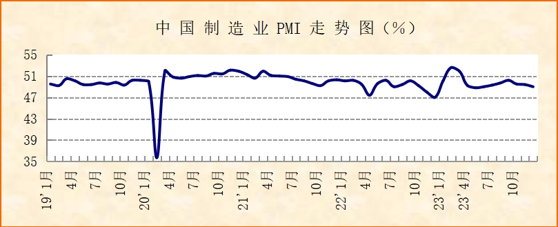 中國物流與采購聯合會、國家統計局服務業調查中心發布的2023年12月份中國制造業采購經理指數(PMI)為49%,較上月下降0.4個百分點,連續3個月小幅下降。從指數的結構變化來看,經濟運行基本平穩,企業生產活動持穩運行,新動能繼續穩定增長。但出口受季節性影響回落明顯,原材料與產成品價格指數差有所擴大。從指數全年走勢來看,經濟呈現穩定恢復、結構向好發展態勢。2024年經濟有望繼續回升向好。